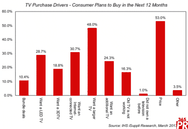 在這次調查前的12個月,促使美國消費者購買電視的最大因素是想要一臺更大的電視。但是,雖然半數(shù)受者者表示尺寸尺寸是其當初購買電視時考慮的重要因素,但在計劃購買電視的消費者中,這一比例降到只有48%。