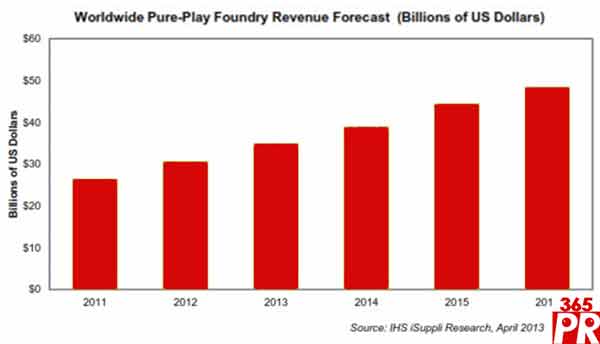 今年全球純晶圓代工產(chǎn)業(yè)的營(yíng)業(yè)收入預(yù)計(jì)達(dá)到350億美元,比2012年的307億美元?jiǎng)旁?4%。2012年該領(lǐng)域大增16%。預(yù)計(jì)2014和2015年繼續(xù)以兩位數(shù)的速度增長(zhǎng),然后到2016年增長(zhǎng)放緩,但增幅仍將達(dá)到9%的穩(wěn)健水平。預(yù)計(jì)2016年純晶圓代工業(yè)的總體營(yíng)業(yè)收入將達(dá)到485億美元。