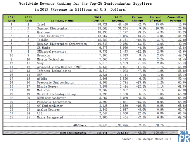 就單個(gè)公司而言,最引人注目的變化有:高通收入暴漲29.2%,排名從2011年的第6名上升到2012年的第3名,其半導(dǎo)體市場(chǎng)份額從去年的3.3%增長至4.3%,增長了一個(gè)百分點(diǎn)。前25家半導(dǎo)體公司中僅有其他兩家公司實(shí)現(xiàn)了兩位數(shù)增長:美商巨積22.6%,索尼21.8%。