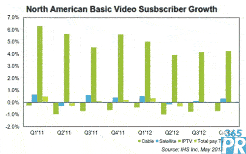 付費電視領域的多數增長來自電信的IPTV領域,還有少量增長來自衛(wèi)星,而有線領域則持續(xù)下降。連續(xù)兩年,有線用戶每個季度都在減少。雖然衛(wèi)星領域保持相對堅挺,但每個季度的增長還不到一個百分點,有些季度出現下降。大贏家一直是IPTV,2012年第四季度其用戶增加4.2%,過去兩年保持大約4.0%或者更高的增長速度。