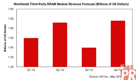 2012年第四季度,五家主要DRAM模組供應(yīng)商的合計營業(yè)收入為15.4億美元,比第三季度的14.0億美元增長10%。這種結(jié)果令人驚喜。第三季度通常是每年旺季,多數(shù)領(lǐng)域都實現(xiàn)了增長,但DRAM模組營業(yè)收入環(huán)比下降9%,令人失望。自從2012年初以來,DRAM模組產(chǎn)業(yè)的營業(yè)收入就難以預(yù)測,各個季度起伏不定。