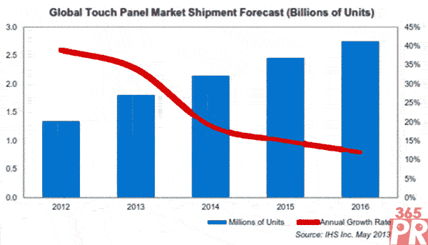 向智能手機和平板電腦以外的市場滲透,將推動觸摸屏產(chǎn)業(yè)的增長。雖然迄今需求仍然主要集中在智能手機和平板電腦領(lǐng)域,但觸摸屏在其它領(lǐng)域的銷售預(yù)計未來幾年將大幅增長,尤其是筆記本電腦領(lǐng)域。