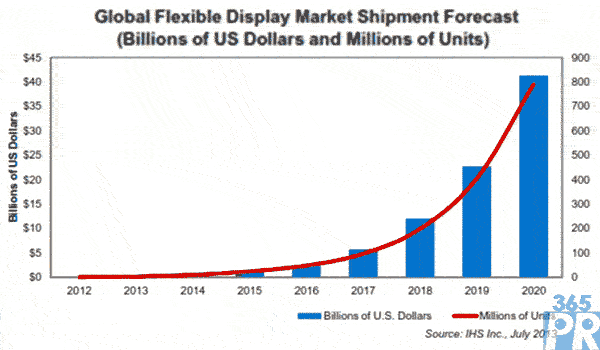 【產(chǎn)通社,7月3日訊】未來七年對于柔性顯示器的需求勢必急劇增長,從智能手機到建筑物上安裝的巨型屏幕等多種應用,將推動其出貨量在2013-2020年激增到將近250倍。據(jù)IHS公司的報告“柔性顯示器技術與市場預測”,預計2020年柔性顯示器的全球出貨量將增至7.92億個,而2013年只有320萬個。同期整體營業(yè)收入將從區(qū)區(qū)10萬美元劇增到413億美元。