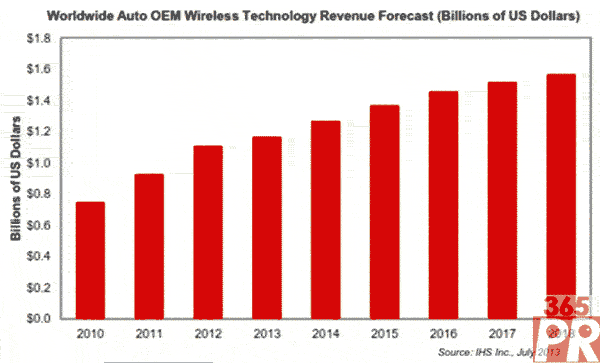 今年車載無線解決方案OEM廠商營業(yè)收入預(yù)計將達到11.7億美元,比去年的11.1億美元增長5%。雖然今年增長率低于2011和2012年的兩位數(shù)水平,但未來幾年將保持增長勢頭。預(yù)計2014和2015年增長率都將在8%左右,營業(yè)收入到2018年將接近15.7億美元。