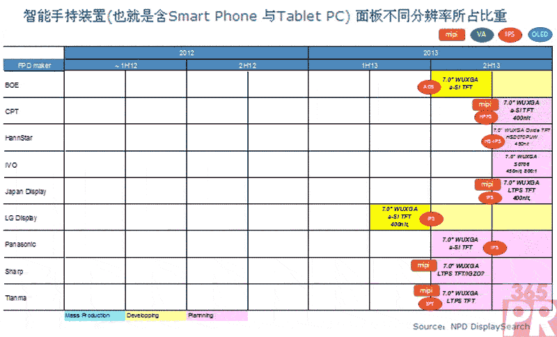 NPD DisplaySearch 指出, 以7吋產(chǎn)品為例,主流面板供貨商多有WUXGA規(guī)格在計(jì)劃在下半年開(kāi)出。其中BOE(京東方)、CPT(華映)、IVO(龍騰)、LG Display、Panasonic基于原有a-Si(非晶硅)TFT產(chǎn)品進(jìn)行升級(jí),JDI、Tianma(天馬)則計(jì)劃采用LTPS(低溫多晶硅)技術(shù),而Hannstar經(jīng)過(guò)評(píng)估后則采取了Oxide(金屬氧化物)技術(shù)路線。此外,Sharp將會(huì)推出基于LTPS或Oxide的WUXGA產(chǎn)品。由于產(chǎn)品參數(shù)已達(dá)325ppi,技術(shù)難度較高,將會(huì)考驗(yàn)各面板廠商的技術(shù)能力及穩(wěn)定量產(chǎn)能力。