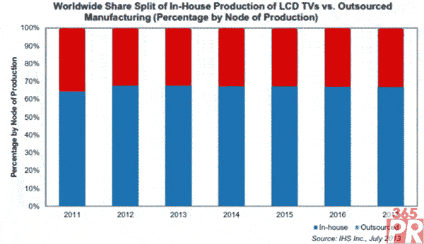 基于相關(guān)的生產(chǎn)節(jié)點,外包制造商生產(chǎn)的液晶電視去年所占份額從2011年的35.4%降到32.2%。相比之下,內(nèi)部生產(chǎn)的液晶電視所占份額則從64.6%上升到67.8%。雖然變動只有幾個百分點,但這種變化意義重大,因為每個生產(chǎn)節(jié)點,不論是外包還是內(nèi)部生產(chǎn),對自己的地盤防守都很嚴密。
