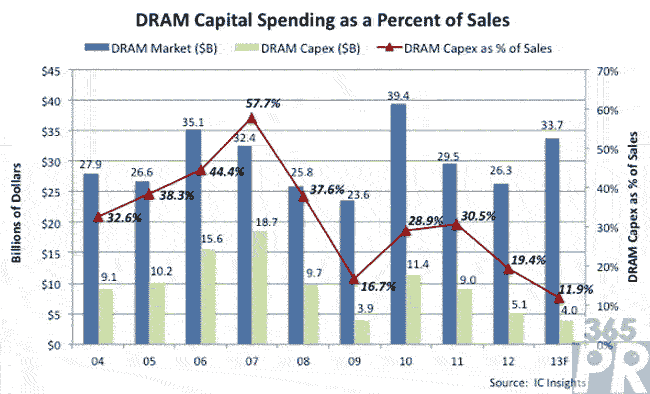 目前DRAM產(chǎn)業(yè)的主要供貨商僅僅剩下三星電子、海力士與美光。簡單來說,未來隨著DRAM產(chǎn)業(yè)走入寡占型態(tài),供應(yīng)與需求的問題不再是單單依賴標(biāo)準(zhǔn)型內(nèi)存的供給與需求來訂制,也就是說,價格漲跌的依據(jù)將隨著DRAM廠商在某一產(chǎn)品變得寡占甚至獨占之后,即使能控制價格。因此,DRAM廠商在進行資本支出時,不用再像以往大筆金額敲進,而變得更有策略且重點式投資,所以IC Insights預(yù)估2013年資本支出占銷售額比例將跌至11.9%。