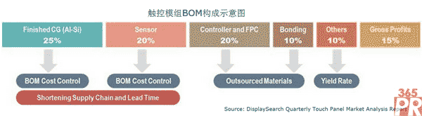 由于受到終端產(chǎn)品價格定位影響,觸控模組的價格空間進(jìn)一步被壓縮。參考觸控模組價格BOM構(gòu)成,觸控業(yè)者除了提高自身產(chǎn)品技術(shù)能力以改善良率水準(zhǔn)外,可藉由產(chǎn)業(yè)鏈整合壓縮產(chǎn)品生產(chǎn)周期(lead time),降低生產(chǎn)成本,以維持既有的獲利能力,同時也可透過產(chǎn)品規(guī)模效益,在日益嚴(yán)峻的產(chǎn)業(yè)競爭挑戰(zhàn)中謀求生存空間。故而國內(nèi)觸控業(yè)者近期動作頻頻,紛紛進(jìn)行產(chǎn)業(yè)整合,調(diào)整自身體質(zhì),謀求更大的市場空間,例如長信并購德普特,布局觸控模組市場;信利簽約臺灣富元,穩(wěn)定OGS sensor供給;歐菲光募資40億元,強(qiáng)化中大尺寸觸控產(chǎn)能,進(jìn)軍顯示面板模組產(chǎn)業(yè);萊寶高科引進(jìn)日本凸版五代線彩膜設(shè)備,布局大尺寸OGS觸控模組產(chǎn)能;星星科技并購深越光電、東山精密接手牧東科技、聯(lián)合化工收購合力泰、京東方正式涉足觸控產(chǎn)業(yè)等。觸控產(chǎn)業(yè)開始由低階產(chǎn)品的無序競爭模式步入規(guī)模化競爭格局,市場將進(jìn)一步向具備技術(shù)優(yōu)勢及規(guī);瘍(yōu)勢的企業(yè)集中,而部分處于弱勢的小型企業(yè)將面臨淘汰出局的壓力。