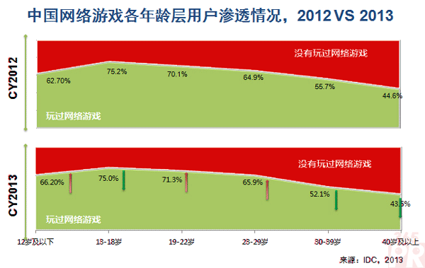 中國(guó)大互聯(lián)網(wǎng)是一個(gè)“娛樂(lè)至死”的微觀社會(huì)縮影,其在一定時(shí)間內(nèi)仍將處于娛樂(lè)與商務(wù)并行的階段。網(wǎng)絡(luò)游戲作為互聯(lián)網(wǎng)娛樂(lè)的典型應(yīng)用,其用戶遷移與發(fā)展路徑將成為商務(wù)類應(yīng)用發(fā)展的前奏。IDC基于2012-2013年對(duì)中國(guó)網(wǎng)絡(luò)游戲用戶的持續(xù)研究發(fā)現(xiàn),低齡用戶(12歲及以下)網(wǎng)絡(luò)游戲滲透率增幅較大,達(dá)到66.2%,而原有網(wǎng)絡(luò)游戲主力人群(30-39歲)滲透率降幅較大,僅為52%。從終端角度來(lái)看,盡管PC仍然是網(wǎng)絡(luò)游戲用戶主要使用的終端設(shè)備,但是19-39歲的網(wǎng)絡(luò)游戲用戶在手機(jī)及平板電腦上的游戲行為明顯增加,游戲的終端遷移將對(duì)網(wǎng)絡(luò)游戲開(kāi)發(fā)商及游戲市場(chǎng)本身產(chǎn)生影響。