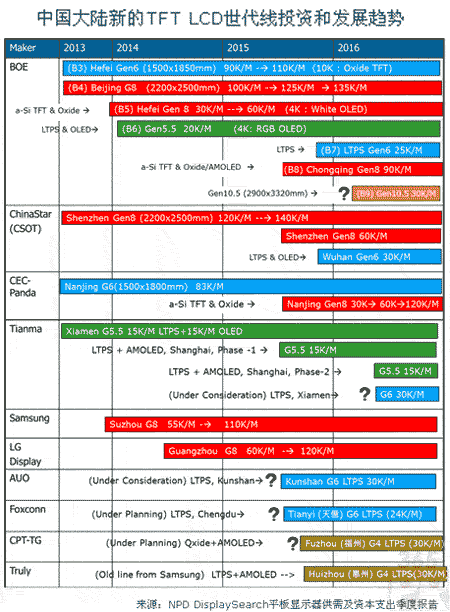 NPD DisplaySearch目前預計在中國大陸2014年到2016年可能新增16座新的面板工廠投入生產(chǎn)。不過有些已開始進入建廠與機臺設備的規(guī)劃,有些則尚處于評估與計劃階段。以下為針對各個新廠投資所進行的分析: