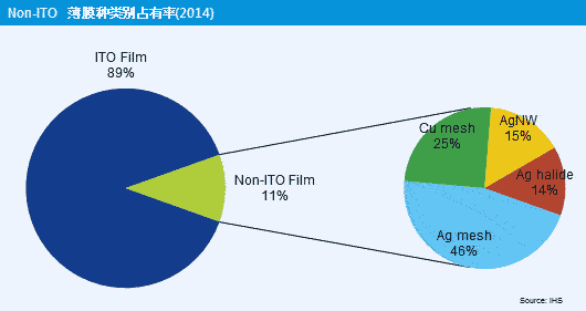就Non-ITO薄膜的面積別來(lái)看,由多數(shù)觸控面板制造商積極投資的Ag mesh以46%占最大的比重,而以電阻值不到10歐姆為主要特征的Cu mesh占25%、以注重厚度與柔韌性等特性主攻中小尺寸應(yīng)用的Silver nano-wire與Ag halide有望分別占15%與14%的比重。