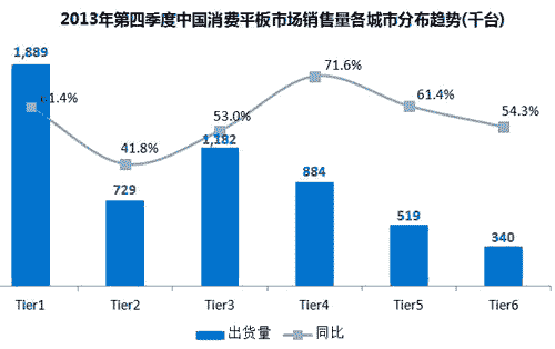 【產(chǎn)通社,5月12日訊】IDC最新發(fā)布的《中國平板市場(chǎng)2000+城市季度跟蹤報(bào)告(2013年第四季度)》顯示,2013 年第四季度消費(fèi)平板市場(chǎng)全國出貨量超過550萬臺(tái),同比上漲近60%;從城市級(jí)別看,一級(jí)城市同比去年上漲61.4%,高過全國平均水平3.6個(gè)百分點(diǎn)。