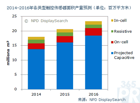 【產(chǎn)通社,6月28日訊】不論是采用玻璃或是塑料薄膜作為傳感器基板,兩者均往更輕、更薄與更好的光學(xué)透光度方向上改進(jìn)。在NPD DisplaySearch最新出版的觸控傳感器市場和演變報告Touch Sensor Market and Evolution Report中,預(yù)測了傳感器的總出貨面積將從2014年的1,800萬平方米增至2015年的2,330萬平方米;其中包含了各種主要的傳感器結(jié)構(gòu)與技術(shù),像是投射電容式、in-cell面板嵌入式、on-cell面板嵌入式和電阻式。另外,以塑料薄膜為基板的各種傳感器結(jié)構(gòu),其總比重也大于以玻璃為基板者。
