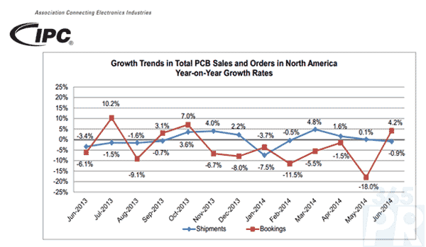 2014年6月份北美地區(qū)PCB行業(yè)的總出貨量,同比下降0.9%,年初至今的出貨量增長(zhǎng)為-0.3%。與上月相比,PCB出貨量,環(huán)比增長(zhǎng)9.1%。