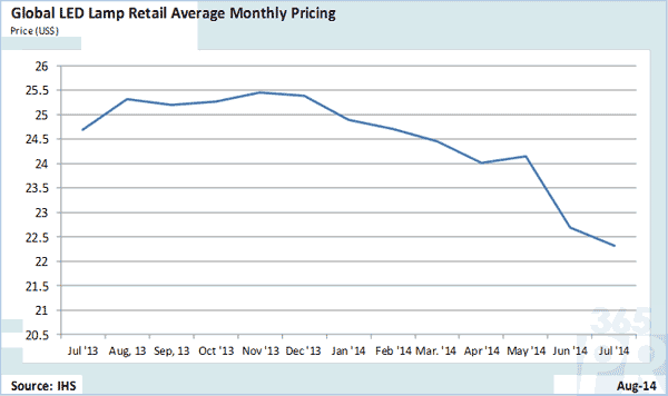 【產(chǎn)通社,8月12日訊】IHS Technology發(fā)布的全球LED燈零售價(jià)格追蹤數(shù)據(jù)顯示,2014年7月份全球LED燈平均零售價(jià)格為$22.31,較前一月下跌了1.6%,較2013年7月下降了9.6%。