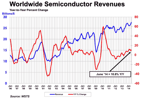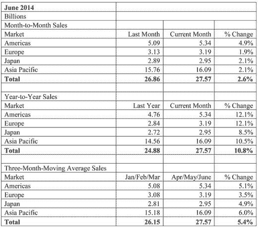 (1)2014年6月,全球半導(dǎo)體銷售額較去年同月的248.8億美元成長10.8%達到275.7億美元,也較5月的268.6億美元成長2.6%。