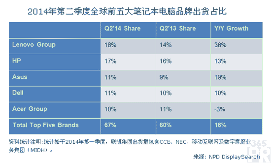 歷經(jīng)去年20%的成長(zhǎng)衰退之后,全球前五大筆記本電腦品牌在2014年第二季度同期增長(zhǎng)16%。聯(lián)想集團(tuán)在歐洲、中國(guó)、拉丁美洲強(qiáng)勁的銷售力道加持下,以18%的市占率超越惠普,躍居筆記本電腦出貨龍頭。華碩因歐洲、中國(guó)、亞洲出貨量持續(xù)增長(zhǎng),取代戴爾來(lái)到第三的位置。反觀同期平板電腦出貨仍持續(xù)下跌,前五大品牌的出貨量同比下降12%YOY。
