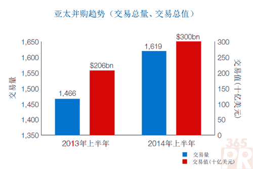 . 2014年上半年亞太區(qū)私募收購交易總量達174宗(500億美元),較去年同期134宗(總值160億美元)的總量有所增長