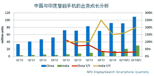 印度智能手機(jī)市場(chǎng)規(guī)模2013年約為3800萬(wàn)臺(tái)。預(yù)估今年有機(jī)會(huì)達(dá)到1億。今年第二季印度智能手機(jī)市場(chǎng)的年成長(zhǎng)率為163%,同期的中國(guó)為28%,NPD DisplaySearch預(yù)估今年第三季印度智能手機(jī)年成長(zhǎng)率將接近200%。雖然規(guī)模仍然小于中國(guó)市場(chǎng),但是如此快速成長(zhǎng)也因此吸引更多品牌與制造商前往印度市場(chǎng)。