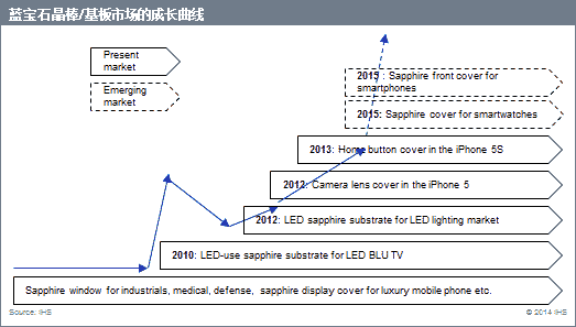 目前蘋果的競爭企業(yè)也在探討蘋果采用藍寶石的舉動。如果市場積極反響蘋果采用藍寶石保護蓋的戰(zhàn)略,那么藍寶石晶棒/基板市場將再一次呈現(xiàn)急速增長勢頭。蘋果的此次舉動不僅對藍寶晶棒/基板市場產生影響,更會對整個智能手機制造產業(yè)也會產生巨大的變化,因此需關注Apple Watch與iPhone采用藍寶石保護蓋的進程。