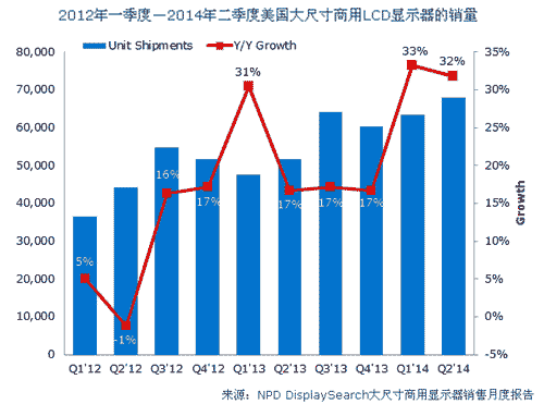 【產(chǎn)通社,9月29日訊】根據(jù)NPD DisplaySearch最新報(bào)告,盡管有來自消費(fèi)者家庭用電視、商用與消費(fèi)者用復(fù)合型顯示器和其它低成本顯示器的競爭壓力,但美國商用LCD的銷售量仍然持續(xù)增長。其中,專門為商業(yè)用途開發(fā)和推廣的26英寸及以上顯示器的終端市場(chǎng)零售銷量于2012年增長近10%,2013年增長20%,2014上半年增長33%。