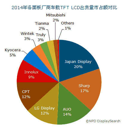 NPD DisplaySearch預(yù)測(cè),今年Japan Display將在車載TFT液晶顯示器出貨量方面占據(jù)最大市場(chǎng)份額,達(dá)20%;其次為夏普17%,臺(tái)灣友達(dá)(AUO)為14%。而去年引領(lǐng)全球市占份額的群創(chuàng)光電為了提高盈利,減少了向中國(guó)市場(chǎng)出貨低價(jià)顯示器;反之聚焦在向歐洲和美國(guó)市場(chǎng)出貨高端車載顯示器,因此其今年市場(chǎng)占有率預(yù)估為9%,較去年下降。