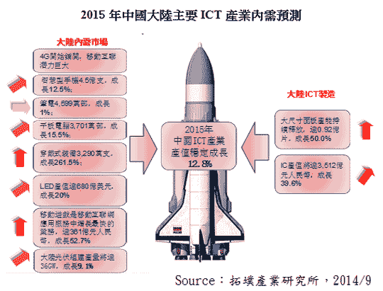 展望2015年,隨著4G全面啟動,以整合移動互聯(lián)網(wǎng)生態(tài)圈、IC設(shè)計和制造逐步市場滲透力以及新能源車爆發(fā)性增長等三大內(nèi)需亮點(diǎn),將引領(lǐng)中國大陸ICT產(chǎn)業(yè)產(chǎn)值穩(wěn)定成長,較2014年的10.9兆元人民幣成長12.8%,達(dá)12.3兆元人民幣。