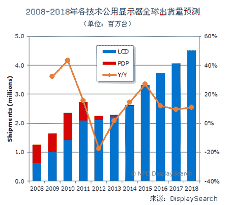 【產(chǎn)通社,11月5日訊】DisplaySearch研究表明,全球大尺寸公用平板顯示市場(chǎng)在經(jīng)歷過(guò)2012年的下滑之后開(kāi)始反彈,并于2013年呈平穩(wěn)增長(zhǎng)趨勢(shì)。隨著全球經(jīng)濟(jì)逐漸從衰退中恢復(fù),加上北美及中國(guó)大陸等商用市場(chǎng)快速發(fā)展,全球公用平板顯示市場(chǎng)出貨量將于2014年增長(zhǎng)14%,2015年增長(zhǎng)27%。