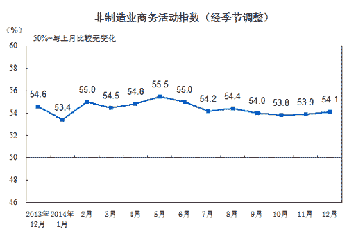 【產(chǎn)通社,1月1日訊】國家統(tǒng)計局(National Bureau of Statistics of China)服務(wù)業(yè)調(diào)查中心數(shù)據(jù)顯示,2014年12月中國非制造業(yè)商務(wù)活動指數(shù)為54.1%,比上月上升0.2%,高于榮枯線4.1%,連續(xù)2個月小幅回升,表明非制造業(yè)總體保持穩(wěn)中有升的發(fā)展態(tài)勢。