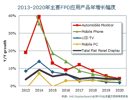 IHS DisplaySearch預(yù)測(cè),2015年FPD主要應(yīng)用產(chǎn)品顯示面板面積的年增長(zhǎng)幅度將為5%,比2014年的9%有所下降。增長(zhǎng)放緩的主要原因是部分FPD產(chǎn)品已趨于成熟,同時(shí)LCD電視和智能手持設(shè)備的大尺寸趨勢(shì)也有所放緩。