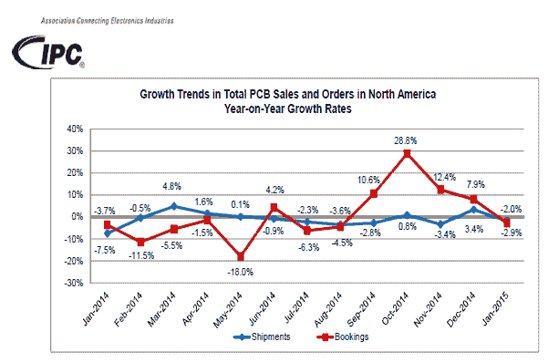 IPC市場調研總監(jiān)Sharon Starr女士說:“2015年1月份北美PCB業(yè)務,與去年同期相比稍有下降,但是訂單出貨比及其它先導性指標顯示2015年增長還有希望!