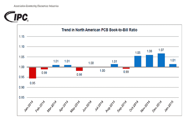 2015年1月份北美地區(qū)PCB行業(yè)訂單出貨比,雖有下降但仍在良性區(qū)域,達到1.01。
