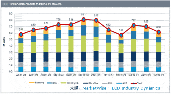 (7)回顧2014年,中國本土市場出貨數(shù)量首現(xiàn)衰退;由于大尺寸化趨勢,出貨面積仍然實現(xiàn)5%(Y/Y)的成長;而在品牌方面,除海信外,其他五大本土品牌整體出貨量衰退7%(Y/Y)。