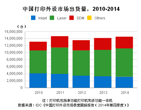 IDC中國負(fù)責(zé)打印外設(shè)市場研究的高級分析師王莎娜認(rèn)為:從全年數(shù)據(jù)來看,2014年中國打印外設(shè)市場銷量有小幅上漲,但是市場需求趨于穩(wěn)定,并未出現(xiàn)過多拉動增長的刺激因素。加之目前的經(jīng)濟(jì)形勢疲軟,來自中小型企業(yè)的購買需求增長會有所放緩。因此我們對于2015年中國打印外設(shè)市場應(yīng)保持謹(jǐn)慎的預(yù)期。不過,中國打印外設(shè)市場在很大程度上也會依賴于行業(yè)用戶的需求,2015年作為“十二五”的收官之年,預(yù)計打印機行業(yè)采購方面會有一定增長,特別是來自于政府、金融、醫(yī)療、電信等行業(yè)的需求。