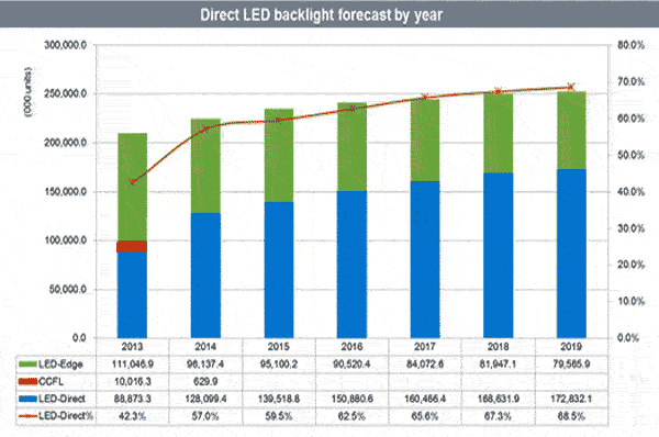 封裝技術(shù)上,Chip Scale Package(CSP)仍為2015直下式背光設(shè)計(jì)的發(fā)展重點(diǎn),原因無他,就是節(jié)省成本——相較于傳統(tǒng)的封裝結(jié)構(gòu),CSP尺寸縮小約34%,而成本可以降低20%。根據(jù)IHS DisplaySearch的LED背光報(bào)告,無意外的直下式背光滲透率大幅提高由2014年的57%進(jìn)步到2015年的59.5%。展望2019年直下式滲透率為68.5%,但是任何一個(gè)技術(shù)都會(huì)有瓶頸,直下式背光設(shè)計(jì)是否能夠在效能和價(jià)格上達(dá)到平衡,其主要原因?yàn)槎喂鈱W(xué)的設(shè)計(jì)是否到達(dá)極限。