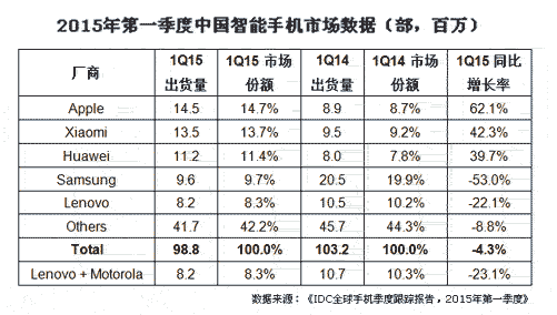 【產(chǎn)通社,5月18日訊】最新的《IDC全球手機(jī)季度跟蹤報(bào)告,2015年第一季度》顯示,2015年第一季度中國手機(jī)市場出貨量為109.8百萬部左右,同比下滑5.6%。其中智能手機(jī)市場出貨量為98.8百萬部左右,同比下降4.3%。這是過去六年以來,中國智能手機(jī)市場第一次出現(xiàn)同比下滑的情況。