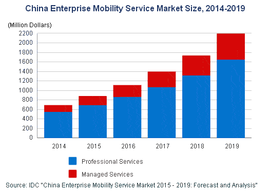 【產(chǎn)通社,6月17日訊】IDC最新發(fā)布的《中國(guó)企業(yè)移動(dòng)服務(wù)市場(chǎng)2015-2019年預(yù)測(cè)與分析》顯示,隨著移動(dòng)設(shè)備的普及和移動(dòng)技術(shù)的日漸成熟,很多企業(yè)已經(jīng)將移動(dòng)作為公司未來1-2年IT建設(shè)的戰(zhàn)略方向。移動(dòng)在企業(yè)中的價(jià)值日益凸顯,這給移動(dòng)服務(wù)市場(chǎng)帶來了非常好的發(fā)展契機(jī),無論是以咨詢、集成和軟件開發(fā)為主的移動(dòng)專業(yè)服務(wù)市場(chǎng),還是以設(shè)備、應(yīng)用、網(wǎng)絡(luò)等運(yùn)維為主的移動(dòng)管理服務(wù)市場(chǎng),都正在經(jīng)歷快速發(fā)展時(shí)期。