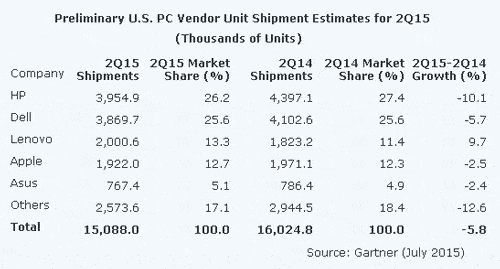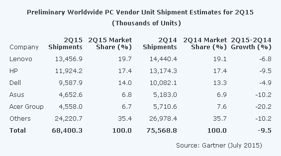 Gartner估計全球PC銷量2015年第二季下降9.5%