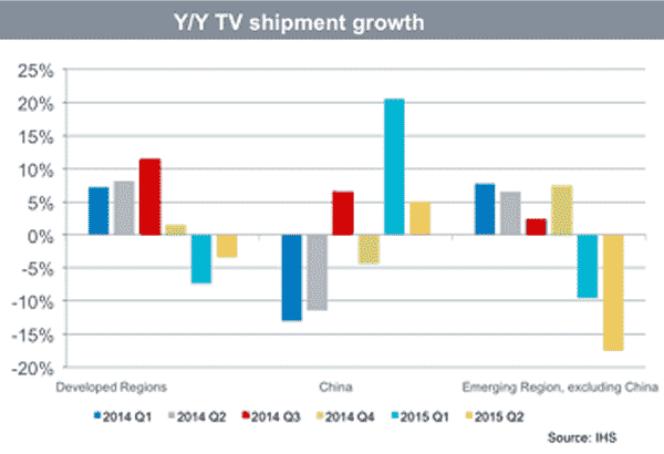 IHS電視研究總監(jiān)Paul Gagnon表示:“2014是電視強(qiáng)勁增長的一年,全球電視總出貨量增長了3個(gè)百分點(diǎn),而發(fā)達(dá)地區(qū)增長超過了6%。但是今年,由于全球經(jīng)濟(jì)放緩,特別是主要地區(qū)貨幣的對(duì)美元大幅貶值,使得電視價(jià)格在新興市場的零售價(jià)上漲,導(dǎo)致電視需求受到嚴(yán)重影響。”