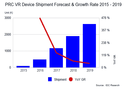 2016年中國虛擬現(xiàn)實設備(VR)出貨量將達48萬臺年增476%