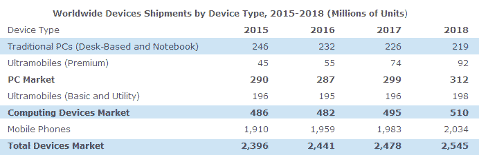 Gartner預(yù)計,2016年傳統(tǒng)PC出貨量將達到2.32億臺,低于2015年的2.46億臺,而2017年和2018年甚至持續(xù)下跌到2.26億臺和2.19億臺。而高階超移動裝置于2016年的出貨量將達到5500萬臺,而2015年為