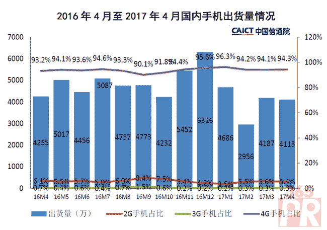 【產(chǎn)通社,5月24日訊】中國信息通信研究院(China Academy of Information and Communications Technology, CAICT)數(shù)據(jù)顯示,2017年4月國內(nèi)手機(jī)市場出貨量4112.8萬部,同比下降3.3%;上市新機(jī)型116款,同比下降35.6%。1-4月,國內(nèi)手機(jī)市場出貨量1.59億部,上市新機(jī)型341款,同比分別增長0.4%和下降32.9%。 4G手機(jī)發(fā)展情況 2017年4月,4G手機(jī)出貨量3880.4萬部,上市新機(jī)型91款,同比分別下降2.2%和40.5%,占比分別為94.3%和78.4%。1-4月4G手機(jī)出貨量1.51億部,上市新機(jī)型280款,同比分別增長4.8%和下降34.1%,占比分別為94.8%和82.1%。 4月份出貨的4G手機(jī)中,全網(wǎng)通手機(jī)占比81.8%。從4G手機(jī)支持的網(wǎng)絡(luò)制式來看,F(xiàn)DD、TD-SCDMA、WCDMA、cdma2000網(wǎng)絡(luò)制式的占比分別為94.1%、98.1%、93.3%、82.6%。 國內(nèi)外品牌構(gòu)成 2017年4月,國產(chǎn)品牌手機(jī)出貨量3843.8萬部,同比增長0.5%,占同期國內(nèi)手機(jī)出貨量的93.5%;上市新機(jī)型109款,同比下降38.4%,占同期國內(nèi)手機(jī)上市新機(jī)型數(shù)量的94.0%。1-4月,國產(chǎn)品牌手機(jī)出貨量1.44億部,同比增長3.3%,占同期國內(nèi)手機(jī)出貨量的90.0%;上市新機(jī)型322 款,同比下降33.6%,占同期國內(nèi)手機(jī)上市新機(jī)型數(shù)量的94.4%。 智能手機(jī)發(fā)展情況 2017年4月,智能手機(jī)出貨量為3858.8萬部,同比下降3.3%,占同期國內(nèi)手機(jī)出貨量的93.8%,其中Android手機(jī)出貨量3331.8萬部。1-4月,智能手機(jī)出貨量為1.51億部,同比增長3.6%,占同期國內(nèi)手機(jī)出貨量的94.6%,其中Android手機(jī)出貨量1.24億部。 2017年4月,上市智能手機(jī)新機(jī)型89款,同比下降42.2%,占同期手機(jī)新機(jī)型總量的76.7%,支持Android操作系統(tǒng)的62款。1-4月,上市智能手機(jī)新機(jī)型275款,同比下降35.7%,占同期新機(jī)型數(shù)量的80.6%,其中支持Android操作系統(tǒng)的199款。 查詢進(jìn)一步信息,請?jiān)L問官方網(wǎng)站 http://www.caict.ac.cn/kxyj/qwfb/qwsj/201705/t20170510_2193243.htm。
