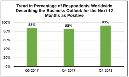 截止2018年1月份,93%的參與調(diào)研者反饋說未來12個(gè)月的商業(yè)前景向好,各個(gè)區(qū)域和細(xì)分行業(yè)均是如此。