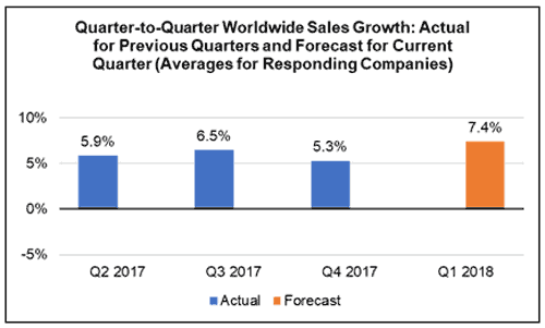 - 2018年第一季度,各地區(qū)各個(gè)細(xì)分行業(yè)的平均銷售增長(zhǎng)率預(yù)計(jì)為正值;并且,美洲的企業(yè)在第一季度預(yù)期平均銷售增長(zhǎng)率最高。