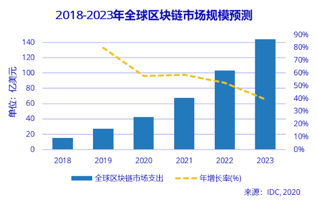 2020年全球區(qū)塊鏈?zhǔn)袌稣w支出在新冠肺炎疫情的影響下有所減少,將達(dá)到42.8億美元。中國仍為全球區(qū)塊鏈?zhǔn)袌鲆?guī)模第二大的單體國家。而與全球趨勢相同,中國區(qū)塊鏈?zhǔn)袌龅耐顿Y規(guī)模也將在疫情的影響下有所減少。IDC預(yù)計,2020年中國區(qū)塊鏈解決方案相關(guān)的總支出將達(dá)到4.7億美元(與疫情前預(yù)測相比下降約12%);在2019-2023年的預(yù)測期間內(nèi),復(fù)合年均增長率預(yù)期將達(dá)到60%(下降約10%)。