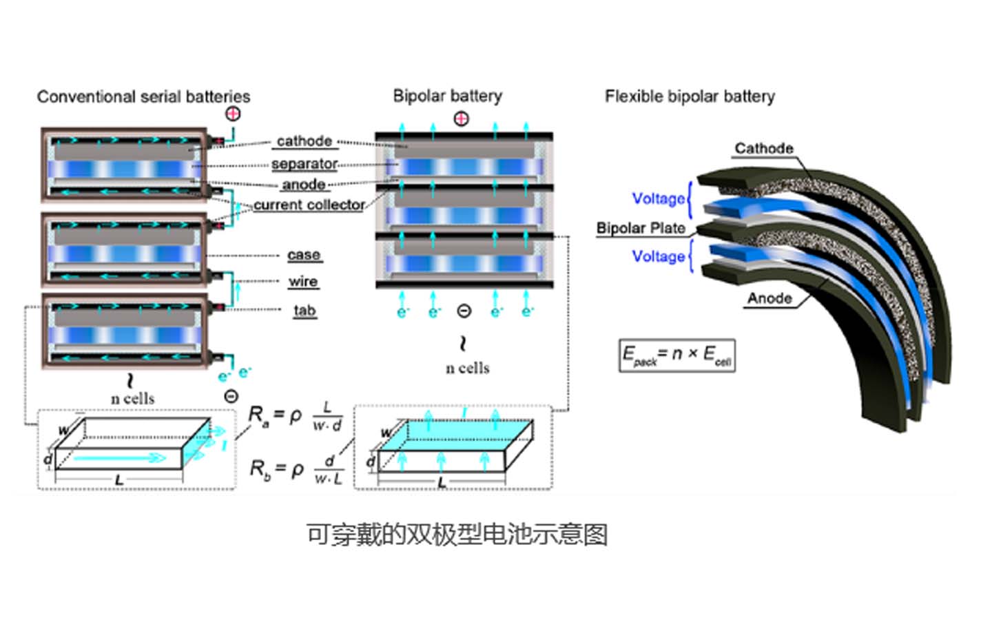 為了滿足柔性和便攜性的雙重要求,柔性電池需要在電極材料選取和電池結(jié)構(gòu)設(shè)計(jì)上同時(shí)具備良好的柔性、高能量密度和較好的安全性能。目前大部分柔性電池的研究主要針對(duì)柔性材料和組件的開(kāi)發(fā),在電池整體結(jié)構(gòu)上仍舊沿襲傳統(tǒng)單極型設(shè)計(jì),并且為了維持電池整體的柔性、導(dǎo)電性和連接性,往往引入大量額外的非活性組件,致使電池能量密度大大降低。鑒于此,針對(duì)可穿戴電池的應(yīng)用特點(diǎn)進(jìn)行電池結(jié)構(gòu)上的創(chuàng)新設(shè)計(jì)尤為重要。