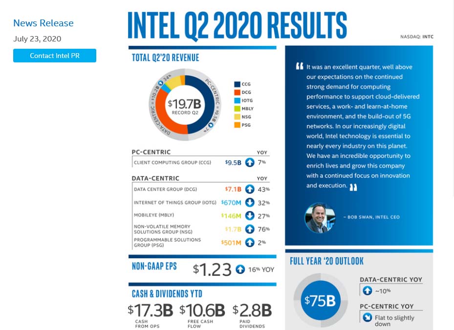 【產(chǎn)通社,7月25日訊】英特爾(Intel)在7月23日發(fā)布的2020財年第二季度財報顯示,其季度營收為197.28億美元,與去年同期的165.05億美元相比增長20%;凈利潤為51.05億美元,與去年同期的41.79億美元相比增長22%。