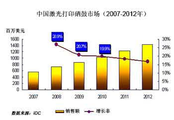 【產(chǎn)通社,9月15日】根據(jù)IDC的調(diào)研分析與預(yù)測(cè),中國(guó)打印機(jī)耗材市場(chǎng)2007年總體銷售額達(dá)9.96億美元,同比2006年增長(zhǎng)了8.5%,預(yù)計(jì)到2012年將達(dá)到19.65億美元。2007-2012年中國(guó)打印機(jī)耗材市場(chǎng)的復(fù)合增長(zhǎng)率(CAGR)為10.6%。激光打印耗材中,硒鼓(Laser Toner)的2007年銷售額為5.65億美元,占噴墨和激光耗材市場(chǎng)總體銷售額的56.8%,同比2006年增長(zhǎng)了17.1%,到2012年將達(dá)到14.4億美元,其2007-2012年復(fù)合增長(zhǎng)率(CAGR)為20.5%。
