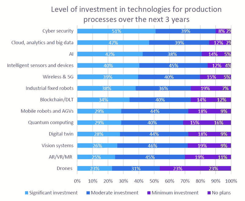 64%的受訪者表示,他們預(yù)計(jì)到2030年將在其主要業(yè)務(wù)中實(shí)現(xiàn)自治運(yùn)營。89%的受訪者表示,他們的公司目前有提高其業(yè)務(wù)自治化水平的計(jì)劃。64%表示他們正在進(jìn)行或正在試行半自治化或全自治化運(yùn)營,而67%則表示到2023年工廠運(yùn)營中大多數(shù)決策流程都將實(shí)現(xiàn)高度自動化。
