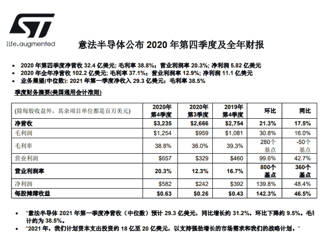 【產(chǎn)通社,2月3日訊】意法半導(dǎo)體(STMicroelectronics)公布了一份漂亮的2020年第四季度及全年財(cái)報(bào),并計(jì)劃擴(kuò)大資本開支以支持戰(zhàn)略計(jì)劃。 報(bào)告顯示,意法半導(dǎo)體在截至2020年12月31日的第四季度凈營(yíng)收總計(jì)32.4億美元,同比增長(zhǎng)17.5%。2020年下半年市場(chǎng)需求超預(yù)期,全年收入增長(zhǎng)6.9%,達(dá)到102.2億美元,毛利率37.1%;營(yíng)業(yè)利潤(rùn)率為12.9%,凈利潤(rùn)11.1億美元。 按業(yè)務(wù)部門看,除了射頻通信RF Communications(以前的“數(shù)字IC”子業(yè)務(wù)部)外,公司所有產(chǎn)品部門都實(shí)現(xiàn)凈銷售額同比增長(zhǎng)。OEM和代理商渠道的收入同比分別增長(zhǎng)19.8%和11.4%。與上個(gè)季度相比,凈營(yíng)收環(huán)比提高21.3%,超出公司指導(dǎo)目標(biāo)區(qū)間最高點(diǎn)580個(gè)基點(diǎn)。除射頻通信子業(yè)務(wù)外,所有產(chǎn)品部門均錄得凈收入環(huán)比增長(zhǎng)。 按產(chǎn)品類別看,模擬器件、MEMS和傳感器產(chǎn)品部(AMS)增長(zhǎng)明顯,營(yíng)業(yè)利潤(rùn)增長(zhǎng)42.9%達(dá)4.02億美元,營(yíng)業(yè)利潤(rùn)率28.3%。微控制器和數(shù)字IC產(chǎn)品部(MDG)營(yíng)業(yè)利潤(rùn)同比增長(zhǎng)46.4%達(dá)1.74億美元,營(yíng)業(yè)利潤(rùn)率20.3%。同期,汽車產(chǎn)品和功率分立器件的銷售收入雙雙增長(zhǎng)。 第四季度末庫(kù)存為18.4億美元,高于去年同期的16.9億美元。季末庫(kù)存周轉(zhuǎn)天數(shù)為84 天,低于去年同期的90天。第四季度自由現(xiàn)金流(非美國(guó)通用會(huì)計(jì)原則)為5.12億美元,去年同期為4.61億美元。 基于強(qiáng)勁增長(zhǎng)的市場(chǎng)需求,意法半導(dǎo)體計(jì)劃2021年資本支出約18-20億美元,以支持強(qiáng)勁增長(zhǎng)的市場(chǎng)需求。(張怡,產(chǎn)通發(fā)布)